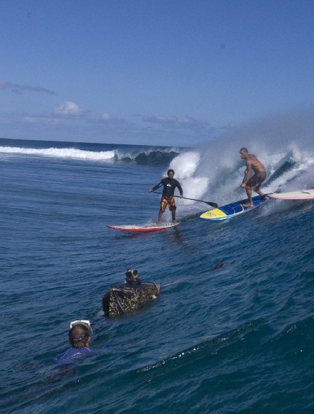 Kelly Slater et son hôte, le tahitien Raimana Van Bastolear, surfent ensemble sur les vagues du célèbre site de Teahupoo, en Polynésie Française.